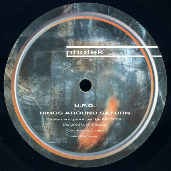 Released in 1995, U.F.O. / Rings Around Saturn is a seminal 12" single by Photek, marking the final release on his self-titled imprint before signing to a major label. This double A-side record is a cornerstone of drum and bass, blending intricate breakbeat production with atmospheric and jazz-infused elements. It laid the groundwork for Photek’s debut album, with the "Rock Dirge" break from "Rings Around Saturn" reappearing in later works like "Smoke Rings."